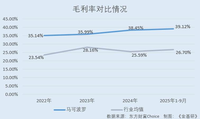 2022-2024年及2025年1-9月,马可波罗的毛利率分别为35.14%、35.99%、38.45%、39.12%。同期,马可波罗招股书中选取的4家同行业可比公司,其毛利率均值分别为23.54%、28.16%、25.59%、26.70%。