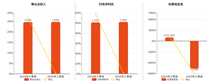 公司营业总收入为7.63亿元。归母净利润为1.39亿元。经营活动现金净流入为-2.19亿元,较去年同报告期经营活动现金净流入减少2.47亿元,同比较去年同期下降902.97%。