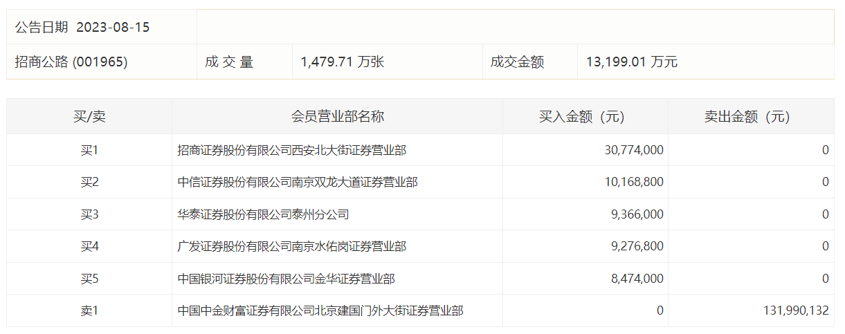 招商公路今日大宗交易折价成交1479.71万股,成交额1.32亿元