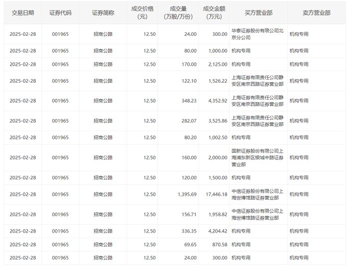 招商公路今日大宗交易折价成交3369万股,成交额4.21亿元