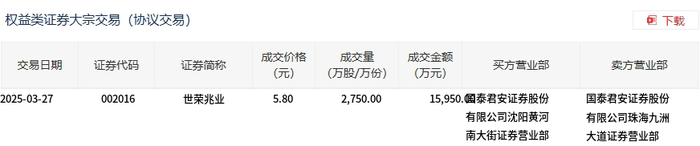 世荣兆业今日大宗交易折价成交2750万股,成交额1.6亿元