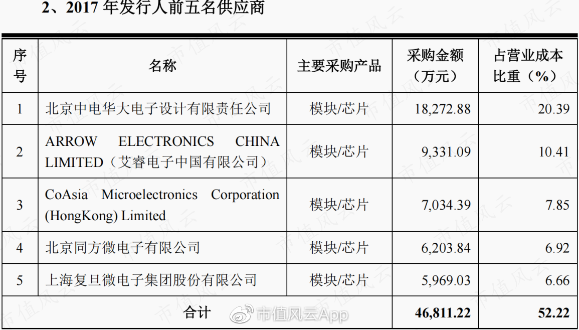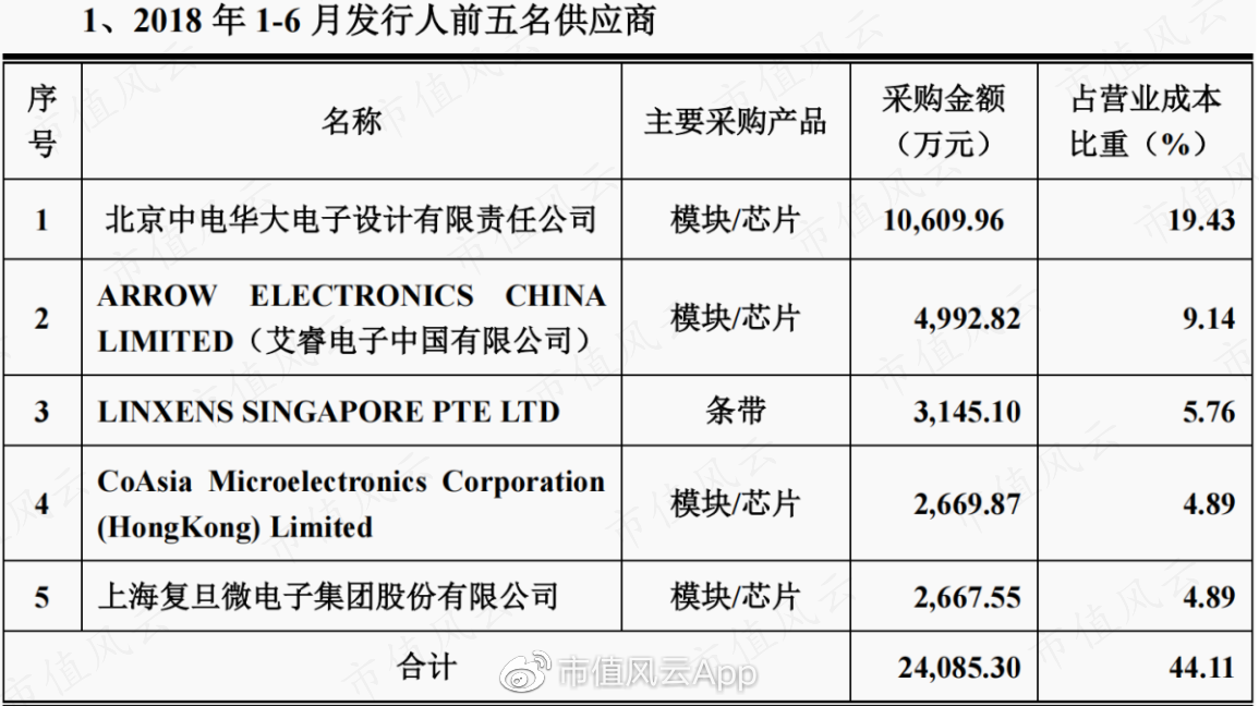 历史上多数年份,北京中电华大电子设计有限责任公司(华大电子)都是公司的第一大供应商,主要供应芯片产品,芯片供应商还包括其他外资品牌厂商。