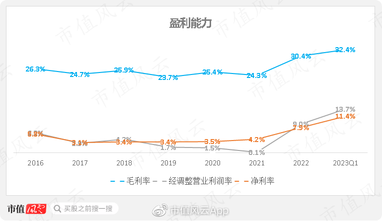 受益于外销毛利率的大幅提升,公司整体盈利能力得到了明显改善。2022年毛利率达到30.4%,2023年一季度为32.4%。2023年一季度,经调整营业利润率达到13.7%。