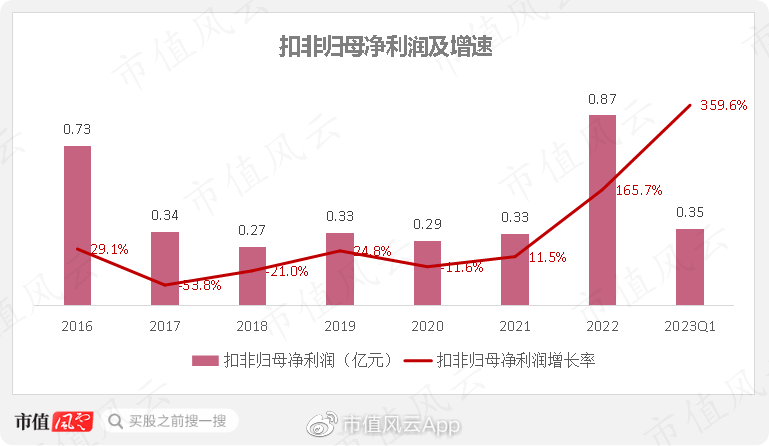 近两年,利润情况也表现较好。2022年扣非归母净利润增速达到165.7%,2023年一季度同比增长359.6%。