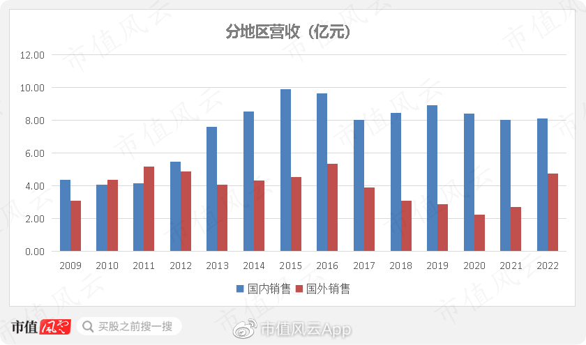 分地区来看,历史上公司营收基本主要来自国内市场。2016年,国外营收为5.35亿元,属于阶段高点,之后下滑较大。
