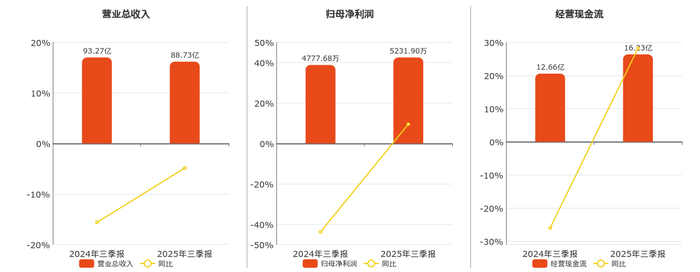 公司营业总收入为88.73亿元,较去年同报告期营业总收入减少4.54亿元,同比较去年同期下降4.86%。归母净利润为5231.90万元,在已披露的同业公司中排名第17。经营活动现金净流入为16.23亿元。