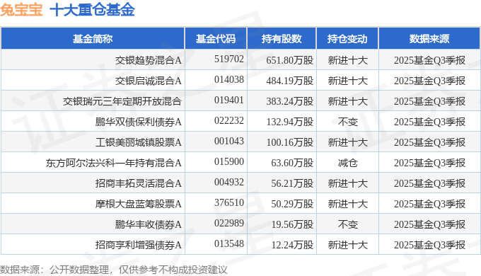 持有兔宝宝最多的基金为交银趋势混合A,目前规模为31.93亿元,最新净值5.1005(10月29日),较上一交易日上涨0.77%,近一年上涨21.13%。该基金现任基金经理为杨金金。