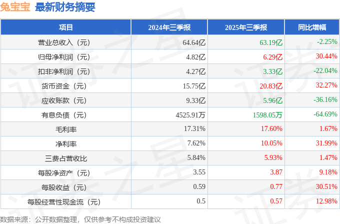 据证券之星公开数据整理,近期兔宝宝(002043)发布2025年三季报。截至本报告期末,公司营业总收入63.19亿元,同比下降2.25%,归母净利润6.29亿元,同比上升30.44%。按单季度数据看,第三季度营业总收入26.84亿元,同比上升5.03%,第三季度归母净利润3.61亿元,同比上升51.67%。本报告期兔宝宝盈利能力上升,毛利率同比增幅1.67%,净利率同比增幅31.99%。