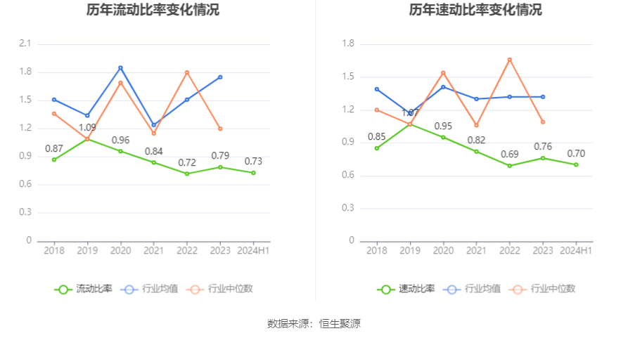 2024年上半年,公司流动比率为0.73,速动比率为0.70。