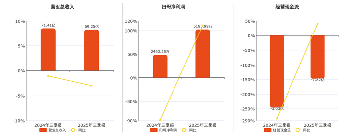 公司营业总收入为69.25亿元,较去年同报告期营业总收入减少2.15亿元,同比较去年同期下降3.01%。归母净利润为5185.99万元。经营活动现金净流入为-1.82亿元,在已披露的同业公司中排名第50。
