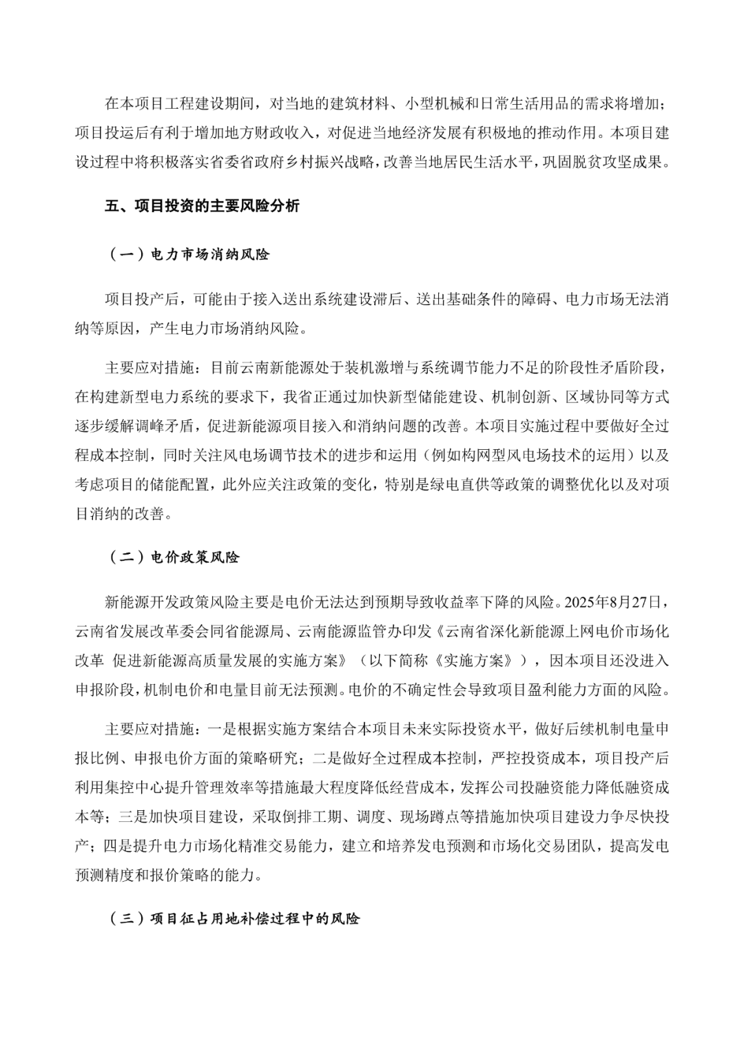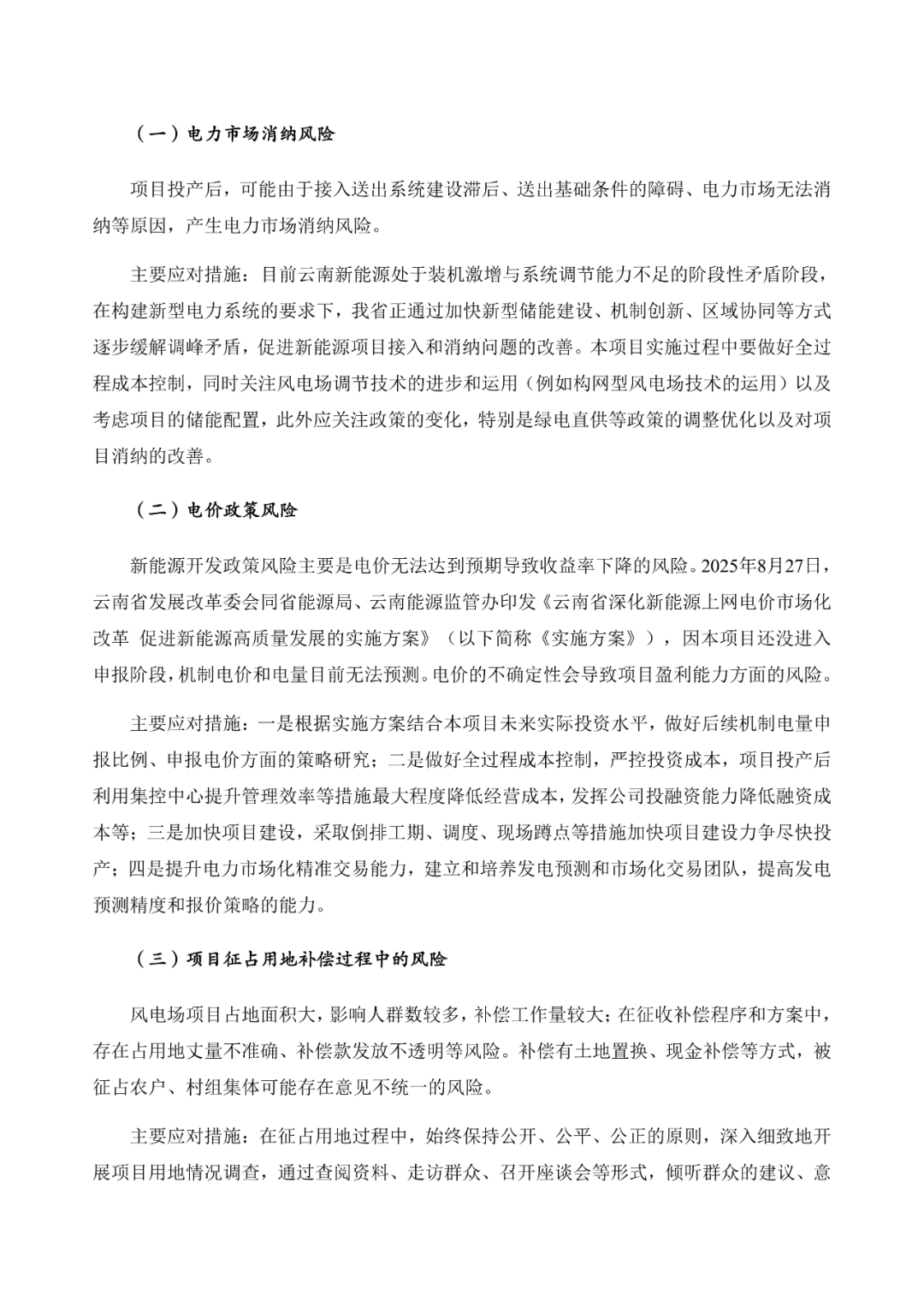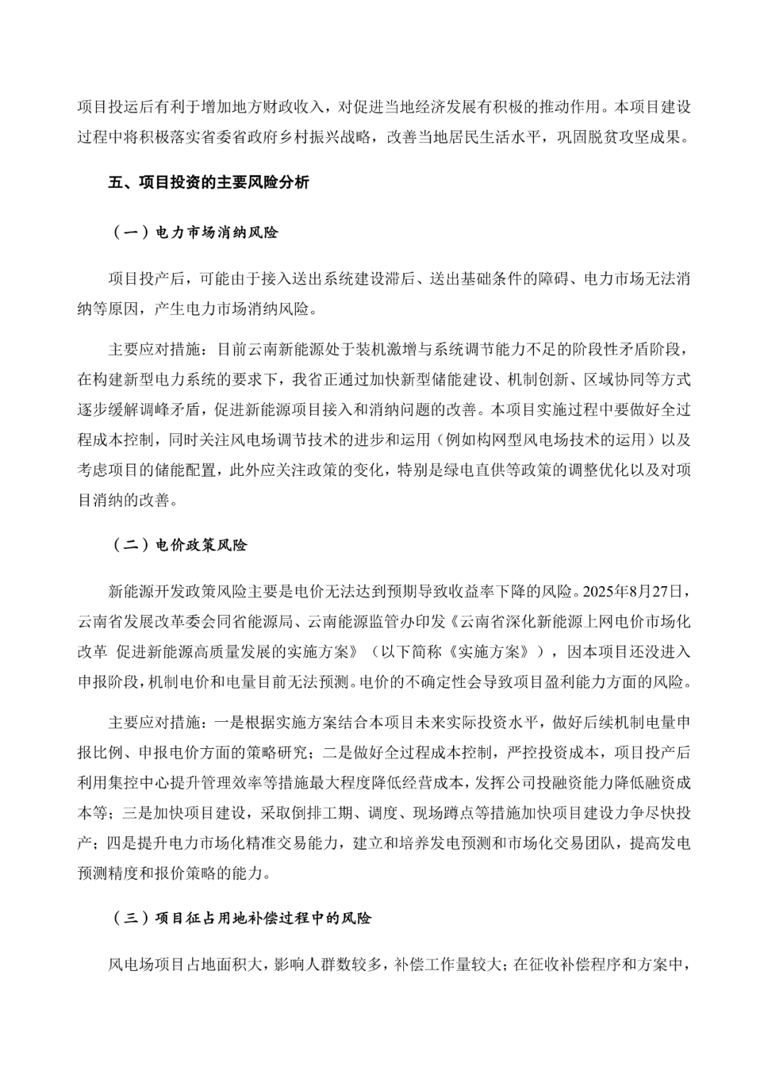 云南能投表示,目前云南新能源处于装机激增与系统调节能力不足的阶段性矛盾阶段,在构建新型电力系统的要求下,我省正通过加快新型储能建设、机制创新、区域协同等方式逐步缓解调峰矛盾,促进新能源项目接入和消纳问题的改善。本项目实施过程中要做好全过程成本控制,同时关注风电场调节技术的进步和运用(例如构网型风电场技术的运用)以及考虑项目的储能配置,此外应关注政策的变化,特别是绿电直供等政策的调整优化以及对项目消纳的改善。