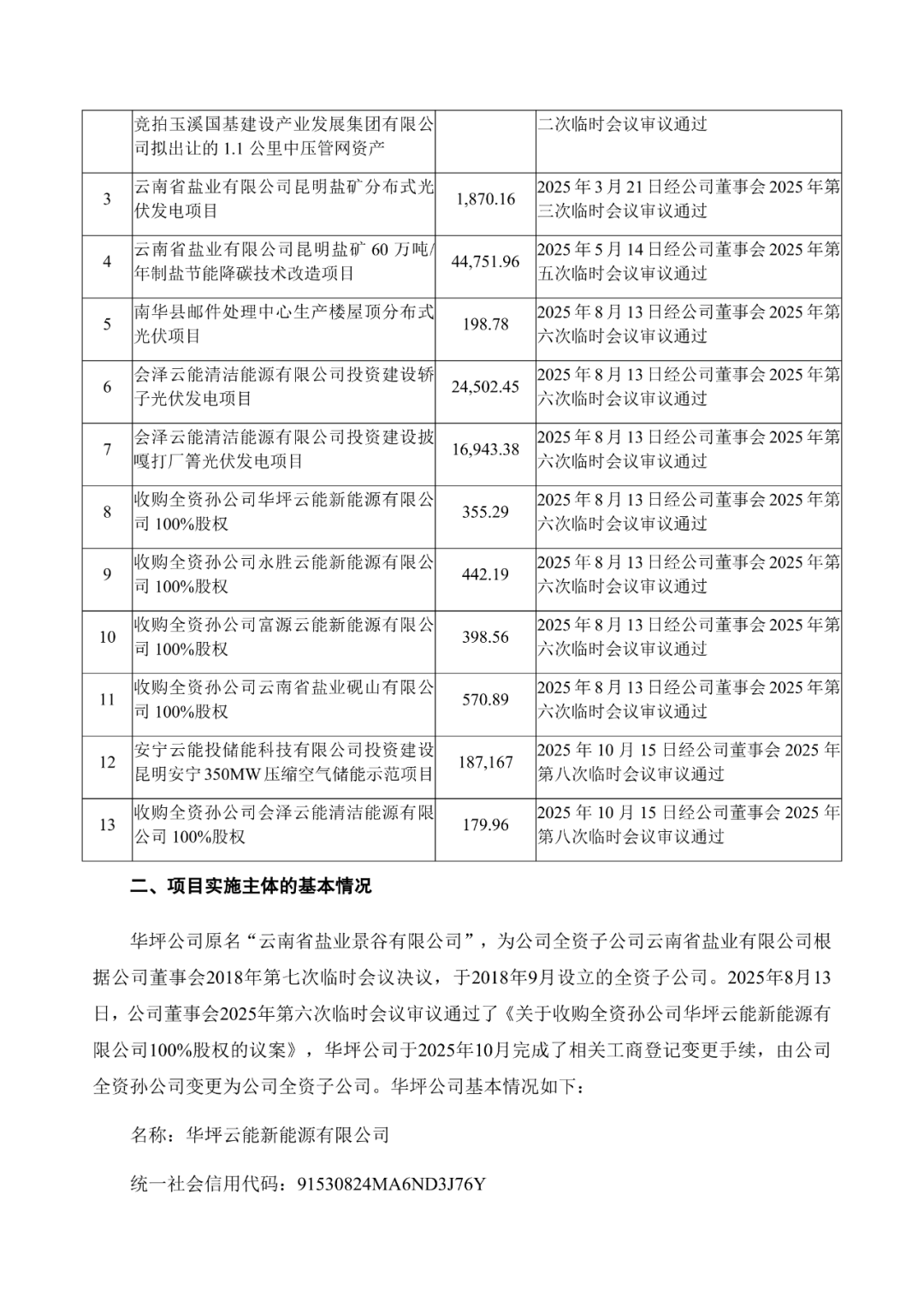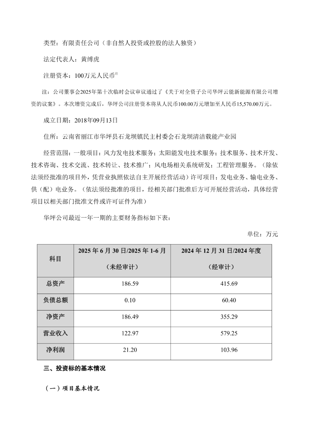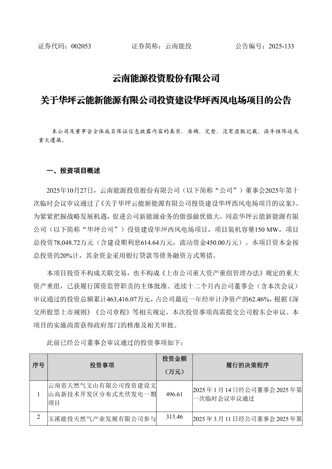 根据《关于华坪云能新能源有限公司投资建设华坪西风电场项目的公告》,云南能投同意华坪云能新能源有限公司(以下简称“华坪公司”)投资建设华坪西风电场项目,项目装机容量150MW,项目总投资78,048.72万元(含建设期利息614.64万元,流动资金450.00万元)。