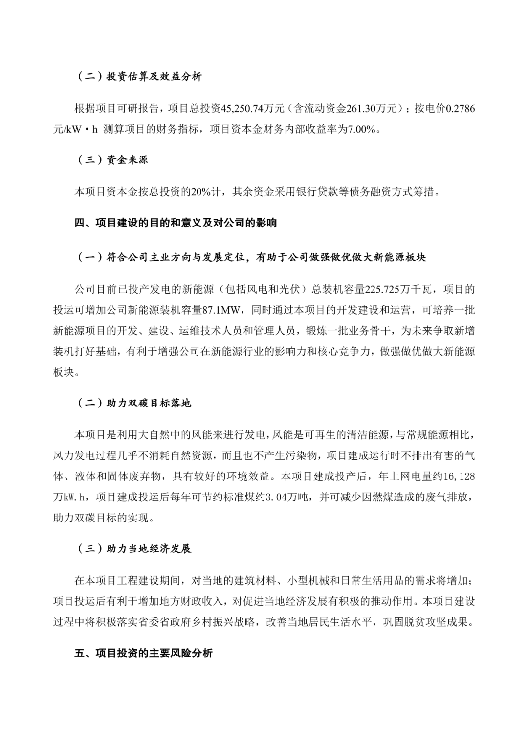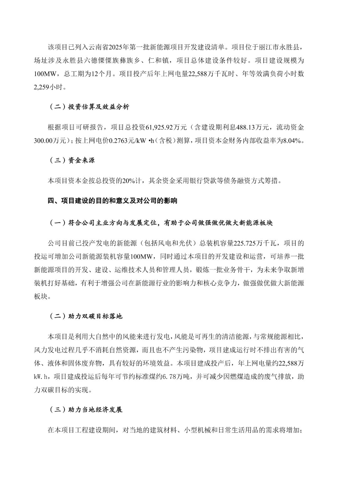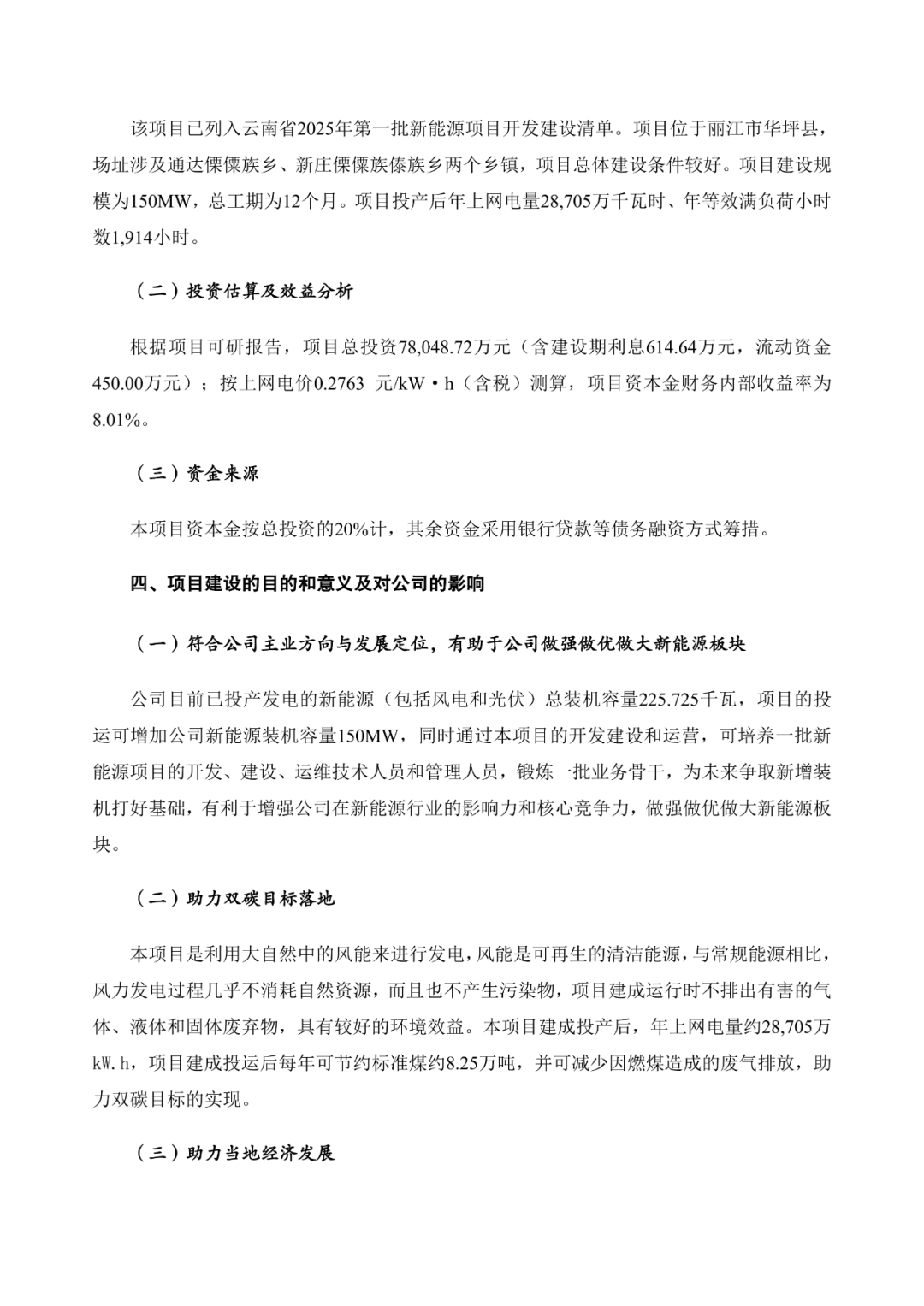 公告指出,按上网电价0.2763元/kW·h(含税)测算,项目资本金财务内部收益率为8.04%。