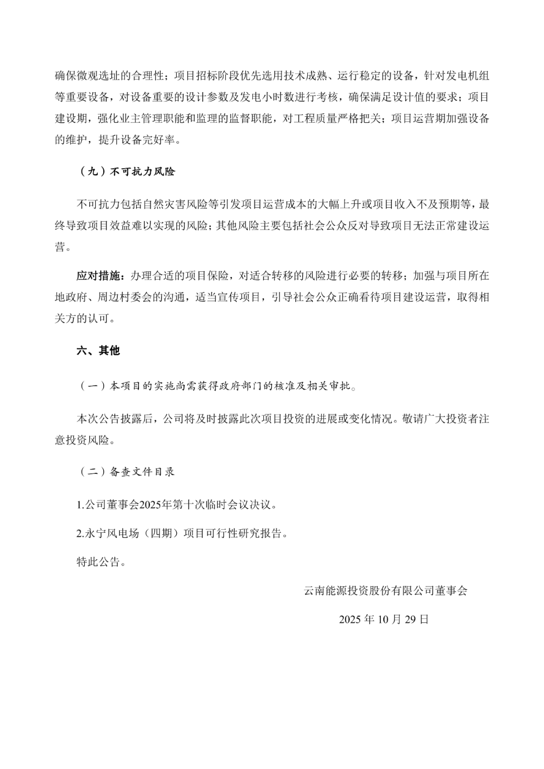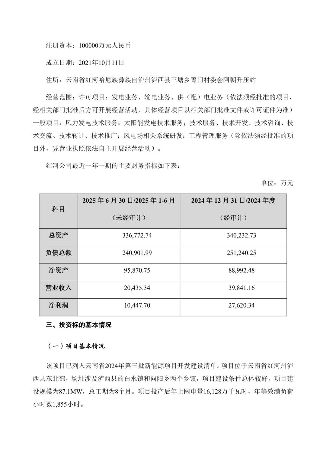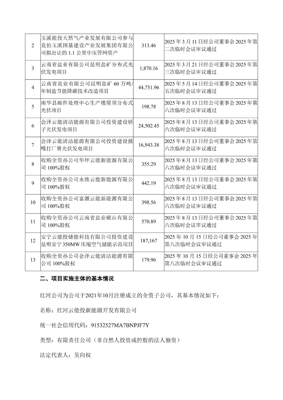 根据《关于红河云能投新能源开发有限公司投资建设永宁风电场(四期)项目的公告》,云南能投同意红河云能投新能源开发有限公司(以下简称“红河公司”)投资建设永宁风电场(四期)项目,项目装机容量87.1MW,项目总投资45,250.74万元(含流动资金261.30万元)。