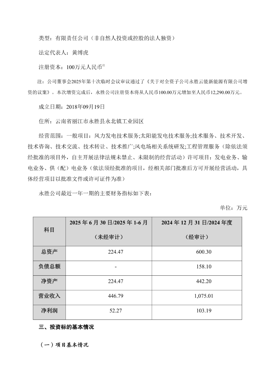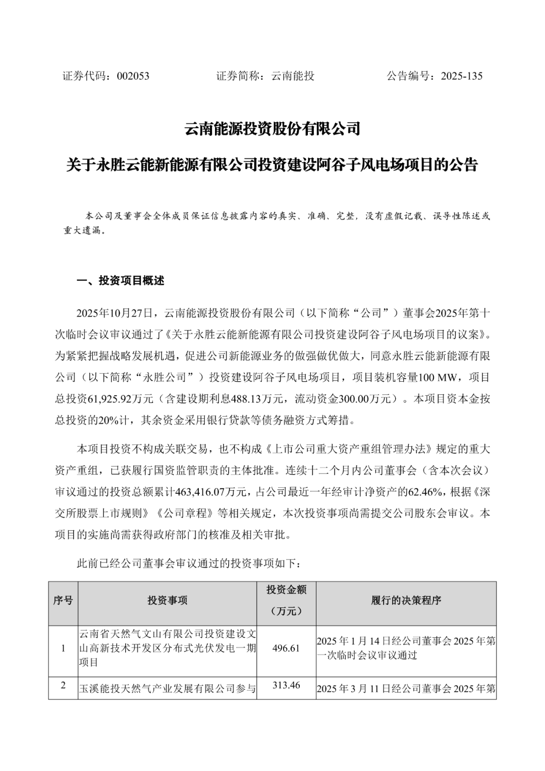 根据《关于永胜云能新能源有限公司投资建设阿谷子风电场项目的公告》,云南能投同意永胜云能新能源有限公司(以下简称“永胜公司”)投资建设阿谷子风电场项目,项目装机容量100MW,项目总投资61,925.92万元(含建设期利息488.13万元,流动资金300.00万元)。