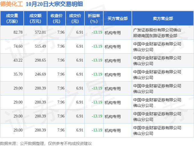 10月20日德美化工现8笔折价13.19%的大宗交易 合计成交2434.4万元