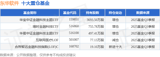 持有东华软件最多的基金为华宝中证金融科技主题ETF,目前规模为123.19亿元,最新净值0.9119(10月29日),较上一交易日上涨1.73%,近一年上涨30.04%。该基金现任基金经理为陈建华 曹旭辰。