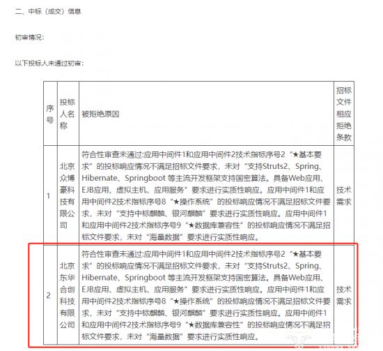 值得一提的是,北京众博豪科技有限公司、北京东华合创科技有限公司两家投标人未通过初审,均因不符合技术需求。具体来看,两家被拒绝原因相同,都是应用中间件1和应用中间件2技术指标序号2“基本要求”、序号8“操作系统”、序号9“数据库兼容性”的投标响应情况不满足招标文件要求。