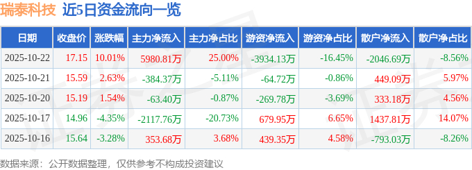 证券之星消息,瑞泰科技10月22日涨停收盘,收盘价17.15元。该股于13点39分涨停,未打开涨停,截止收盘封单资金为1.19亿元,占其流通市值3.01%。