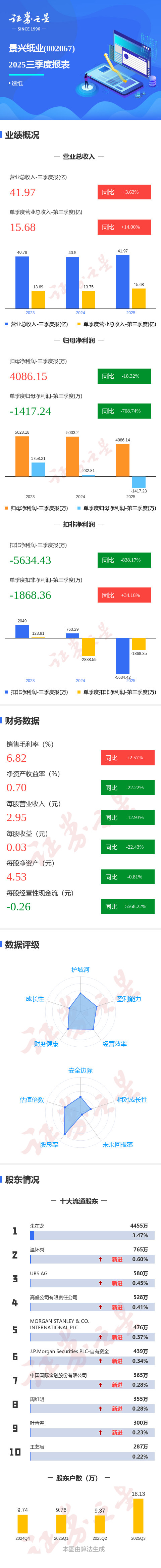 图解景兴纸业三季报:第三季度单季净利润同比下降708.74%