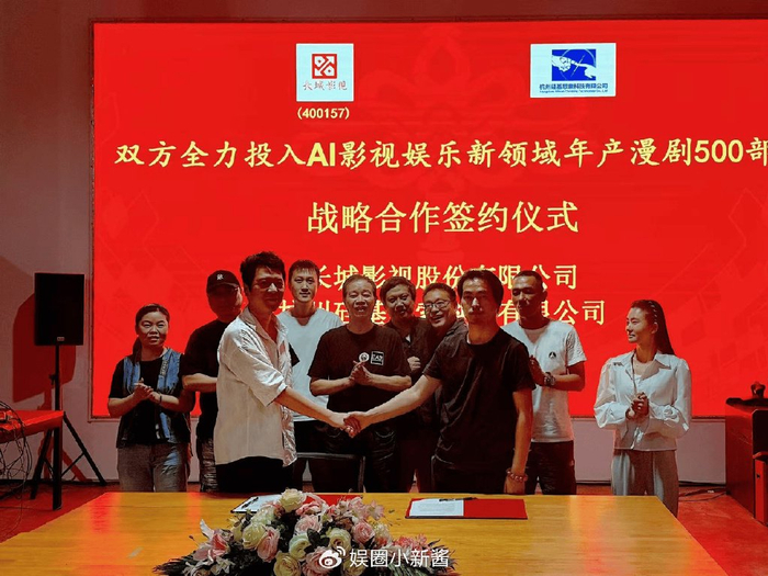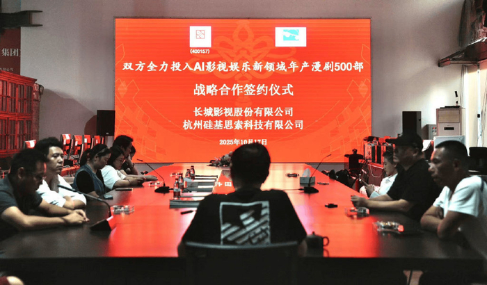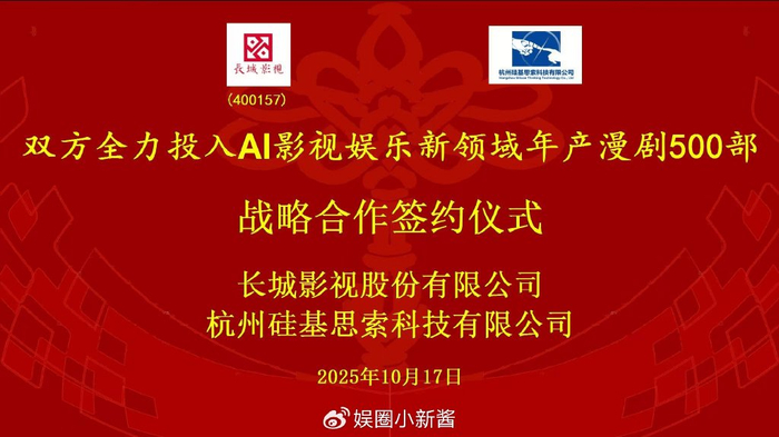 2025 年 10 月 17 日,长城影视股份有限公司(证券代码:400157)与杭州市硅基思索科技有限公司正式签署战略合作协定,宣布全方位布局 AI 影视娱乐新赛道,计划组建 50 家以上创作团队实现年产 500 部 AI 漫剧的行业级目标,标志着传统影视巨头与 AI 技术新锐的深度融合进入实质阶段。