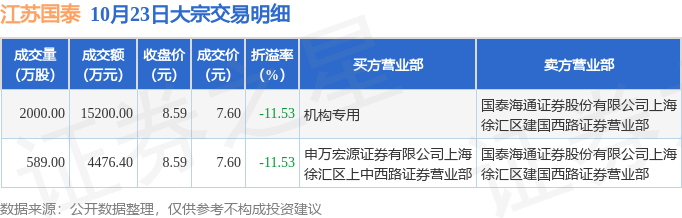 10月23日江苏国泰现2笔折价11.52%的大宗交易 合计成交1.97亿元