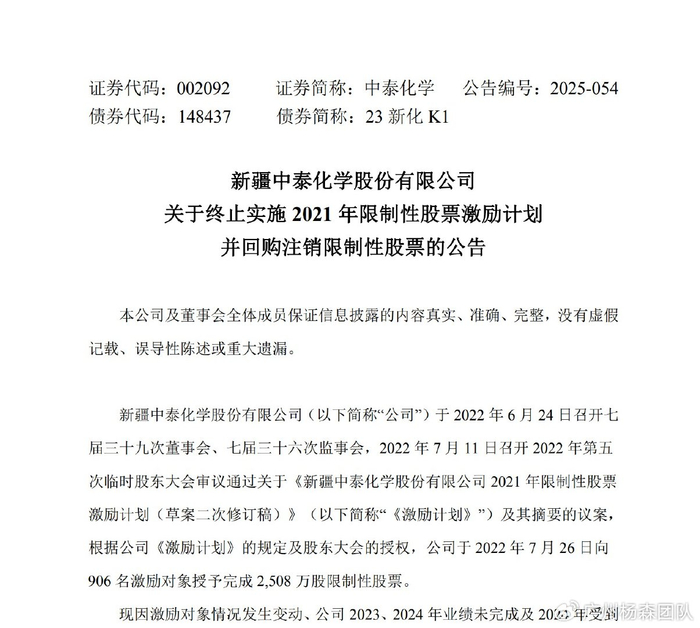 2025年10月24日,中泰化学披露《关于终止实施2021年限制性股票激励计划并回购注销限制性股票的公告》,公司于2022 年7 月26 日向906 名激励对象授予完成 2,508 万股限制性股票。