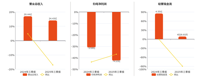 公司营业总收入为24.43亿元,在已披露的同业公司中排名第31,较去年同报告期营业总收入减少5.01亿元,同比较去年同期下降17.02%。归母净利润为-4.23亿元,在已披露的同业公司中排名第59,较去年同报告期归母净利润减少1.14亿元。经营活动现金净流入为4529.93万元,在已披露的同业公司中排名第38,较去年同报告期经营活动现金净流入减少4.09亿元,同比较去年同期下降90.03%。