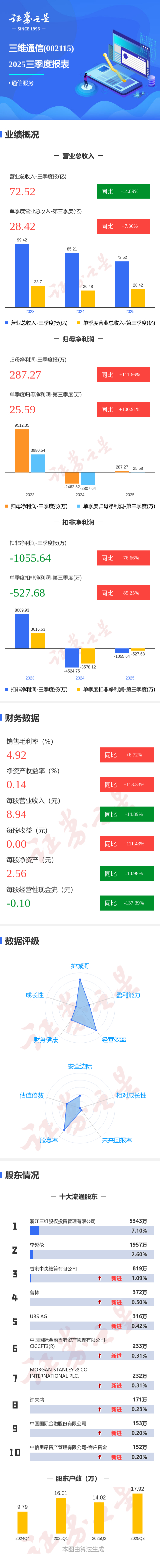 证券之星消息,三维通信2025年三季报显示,公司主营收入72.52亿元,同比下降14.89%;归母净利润287.27万元,同比上升111.67%;扣非净利润-1055.64万元,同比上升76.67%;其中2025年第三季度,公司单季度主营收入28.42亿元,同比上升7.31%;单季度归母净利润25.59万元,同比上升100.91%;单季度扣非净利润-527.68万元,同比上升85.25%;负债率43.93%,投资收益1547.84万元,财务费用1589.66万元,毛利率4.92%。
