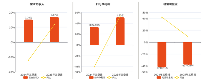 公司营业总收入为8.67亿元。归母净利润为1.23亿元。经营活动现金净流入为-3377.79万元。