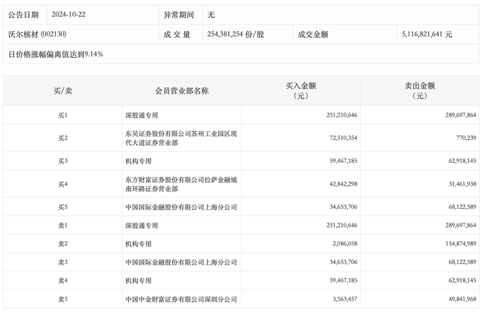 10月22日,沃尔核材今日涨停,龙虎榜数据显示,上榜营业部席位全天成交11.24亿元,占当日总成交金额比例为21.97%。其中,买入金额为4.66亿元,卖出金额为6.58亿元,合计净卖出1.91亿元。