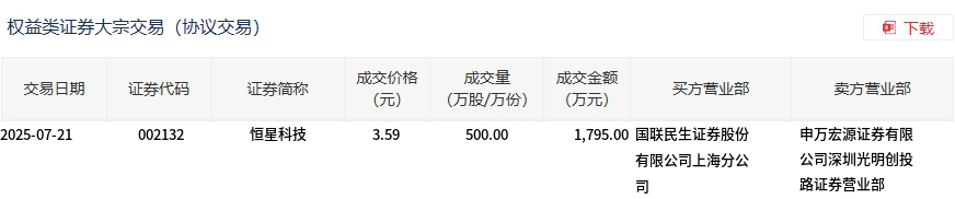 恒星科技今日大宗交易折价成交500万股,成交额1795万元