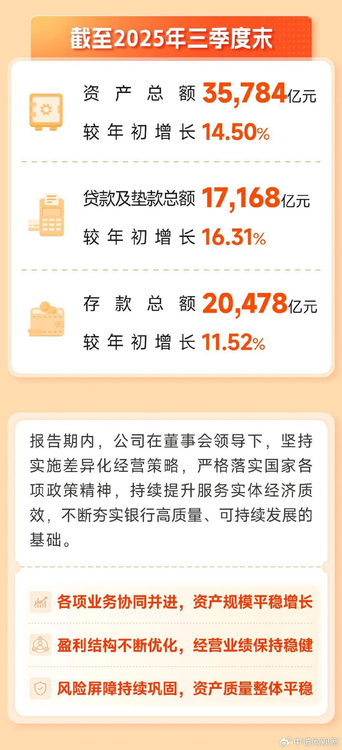 资产规模方面,截至2025年9月末,宁波银行资产总额达到3.58万亿元,较年初增长14.50%,首次突破3.5万亿元大关,其中,贷款总额1.72万亿元,较年初增长16.31%;存款总额2.05万亿元,较年初增长11.52%。整体来看,宁波银行三季度交出了一份规模、营收、利润协同增长的业绩答卷。