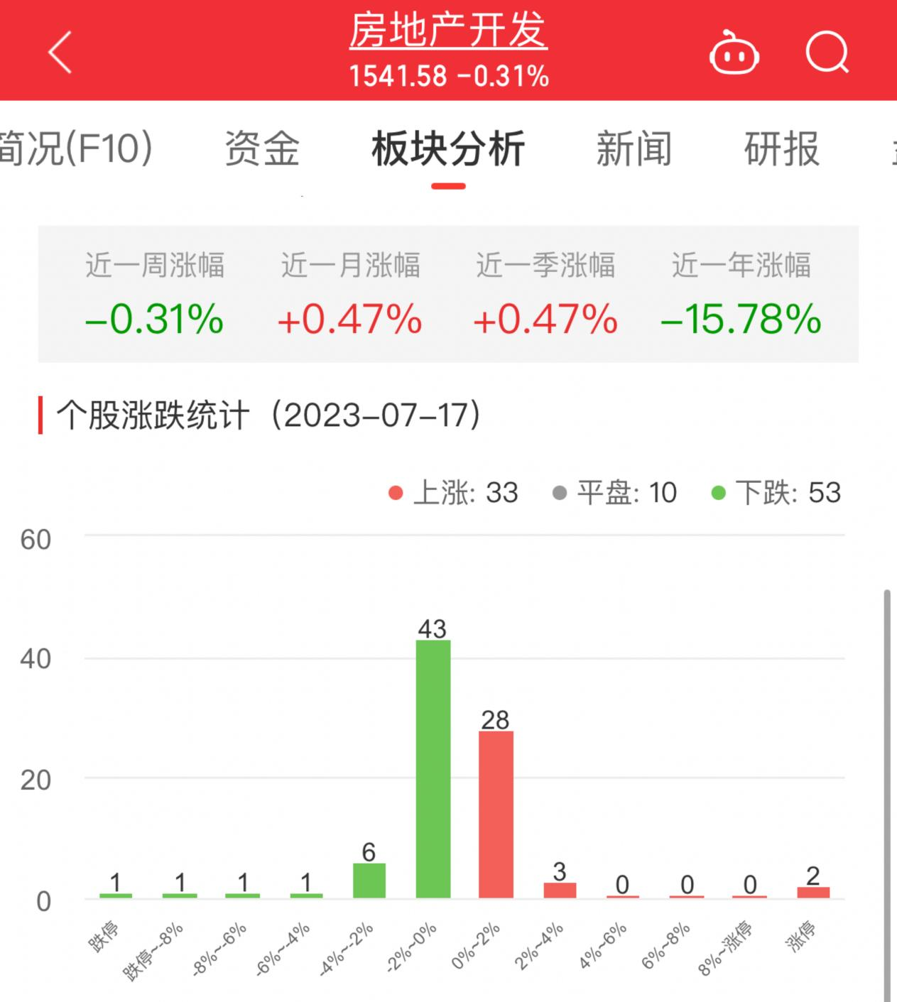 中国经济网北京7月17日讯 今日,房地产开发板块整体跌幅0.31%,其中33只股票上涨,10只股票平盘,53只股票下跌。