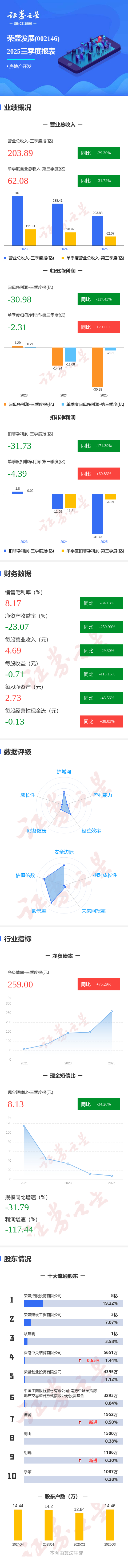 证券之星消息,荣盛发展2025年三季报显示,前三季度公司主营收入203.89亿元,同比下降29.31%;归母净利润-30.98亿元,同比下降117.44%;扣非净利润-31.73亿元,同比下降171.39%;其中2025年第三季度,公司单季度主营收入62.08亿元,同比下降31.73%;单季度归母净利润-2.31亿元,同比上升79.12%;单季度扣非净利润-4.39亿元,同比上升60.83%;负债率89.58%,投资收益-3474.8万元,财务费用10.44亿元,毛利率8.17%。