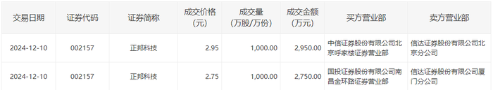12月10日大宗交易成交2000万股,成交额5700万元,占当日总成交额的7.95%,成交均价2.85元,较市场收盘价3.09元折价7.77%,其中最高成交价2.95元,最低成交价2.75元。
