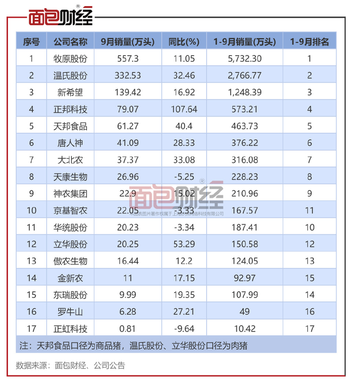 上市猪企9月销量同比上升16.8% 正邦科技、立华股份销量增速靠前