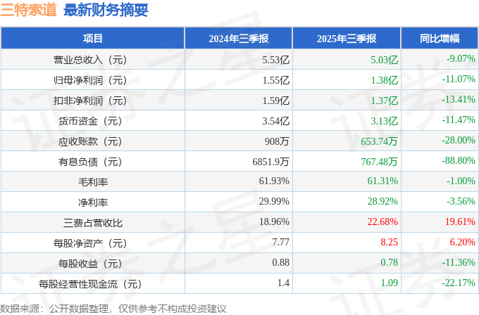 据证券之星公开数据整理,近期三特索道(002159)发布2025年三季报。根据财报显示,三特索道净利润同比下降11.07%。截至本报告期末,公司营业总收入5.03亿元,同比下降9.07%,归母净利润1.38亿元,同比下降11.07%。按单季度数据看,第三季度营业总收入2.11亿元,同比下降12.82%,第三季度归母净利润7068.27万元,同比下降10.67%。