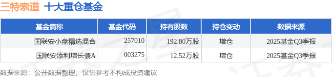 持有三特索道最多的基金为国联安小盘精选混合,目前规模为9.2亿元,最新净值1.142(10月29日),较上一交易日上涨1.51%,近一年上涨14.45%。该基金现任基金经理为邹新进。