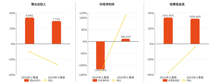 公司营业总收入为7.71亿元,较去年同报告期营业总收入减少1.18亿元,同比较去年同期下降13.23%。归母净利润为308.43万元。经营活动现金净流入为3209.69万元,较去年同报告期经营活动现金净流入减少142.11万元,同比较去年同期下降4.24%。