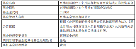 中国经济网北京9月30日讯今日,兴华基金管理有限公司公告,黄兵离任兴华创新医疗6个月持有期混合发起式。
