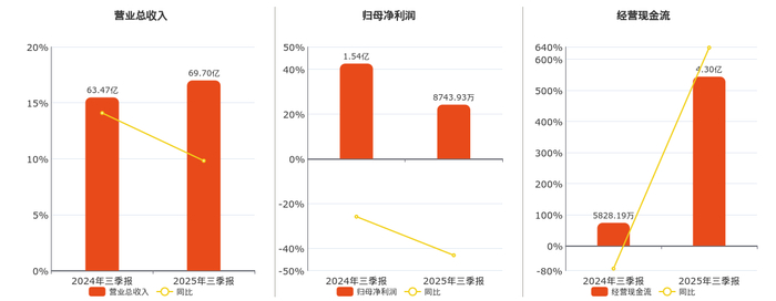 公司营业总收入为69.70亿元,在已披露的同业公司中排名第5,较去年同报告期营业总收入增加6.23亿元,实现2年连续上涨,同比较去年同期上涨9.82%。归母净利润为8743.93万元,在已披露的同业公司中排名第11,较去年同报告期归母净利润减少6632.08万元,同比较去年同期下降43.13%。经营活动现金净流入为4.30亿元,在已披露的同业公司中排名第6,较去年同报告期经营活动现金净流入增加3.72亿元,同比较去年同期上涨637.53%。