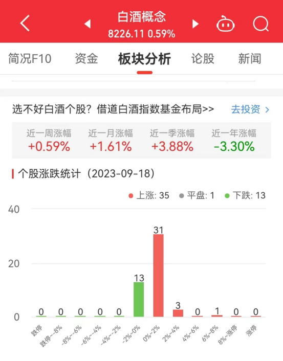 中国经济网北京9月18日讯今日,白酒概念板块整体涨幅0.59%,其中35只股票上涨,1只股票平盘,13只股票下跌。