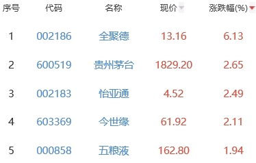 其中,全聚德、贵州茅台、怡亚通、今世缘、五粮液位列板块涨幅前五位,涨幅分别为6.13%、2.65%、2.49%、2.11%、1.94%。