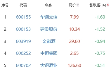 华创云信、建发股份、金徽酒、中恒集团、舍得酒业位列涨幅榜后五位,涨幅分别为-1.60%、-1.52%、-0.94%、-0.75%、-0.51%。