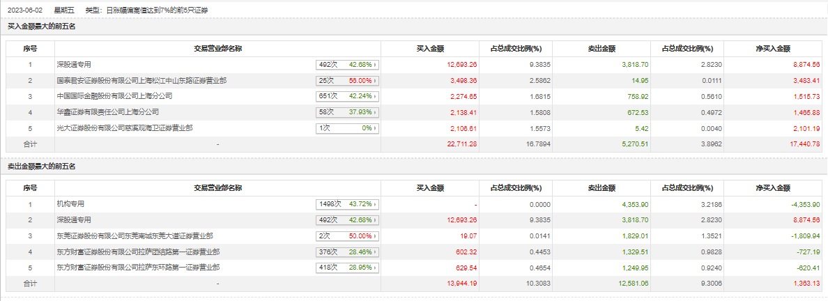 具体来看,机构合计净卖出4353.9万元。此外,深股通专用、国泰君安证券上海松江中山东路证券营业部分别买入1.27亿元、3498.36万元;深股通专用、东莞证券东莞南城东莞大道证券营业部分别卖出3818.70万元、1829.01万元。