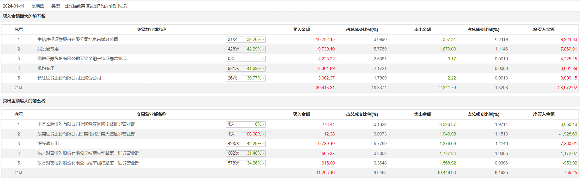 融捷股份1月11日涨停,全天换手率达11.71%,振幅达11.13%。龙虎榜数据显示,营业部席位合计净买入2.16亿元。其中,机构合计净买入3661.89万元。此外,中信建投证券北京东城分公司、深股通专用分别买入1.03亿元、9739.10万元;申万宏源证券有限公司上海静安区海宁路证券营业部、东莞证券东莞南城东莞大道证券营业部分别卖出3323.57万元、1940.98万元。