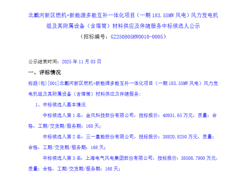 风芒能源获悉,近日,北戴河新区燃机+新能源多能互补一体化项目(一期183.55MW风电)风力发电机组及其附属设备(含塔筒)材料供应及伴随服务中标候选人公示。