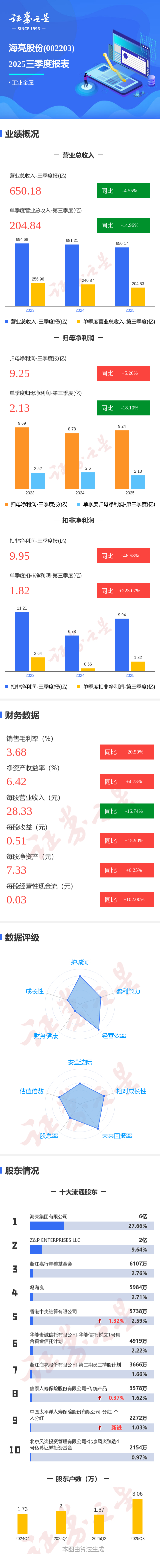 图解海亮股份三季报:第三季度单季净利润同比下降18.11%