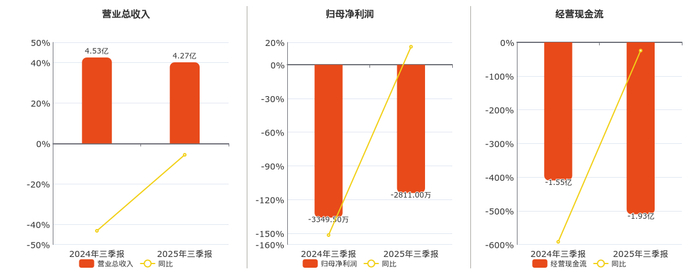 公司营业总收入为4.27亿元。归母净利润为-2811.00万元,较去年同报告期归母净利润增加538.50万元。经营活动现金净流入为-1.93亿元。